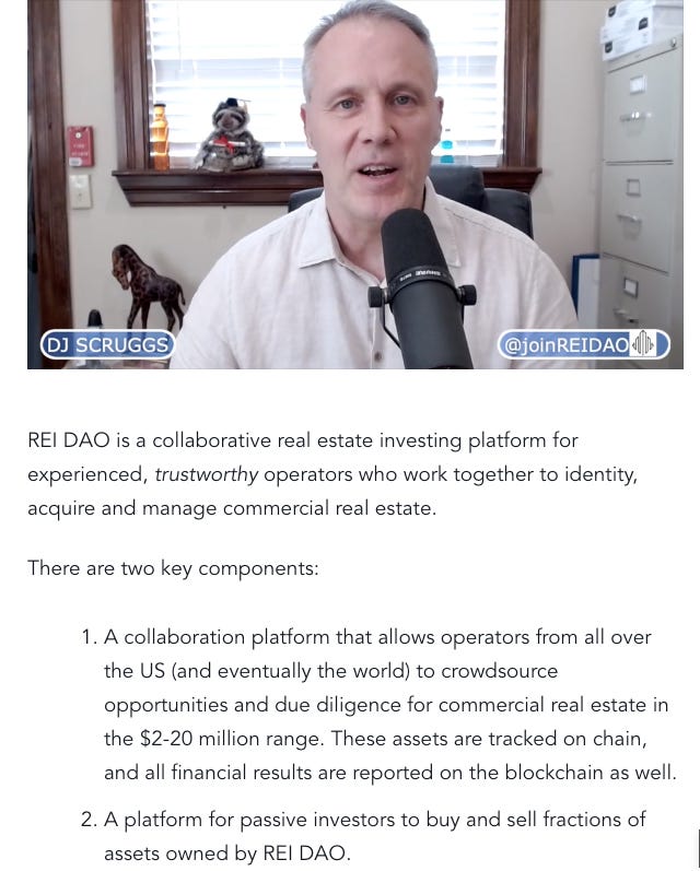 We are still pre-launch at REI DAO and figuring out what resonates with our audience. While our home page mentions blockchain, we don’t make a big deal of it. Instead I created a video to explain that our focus is on general partners.