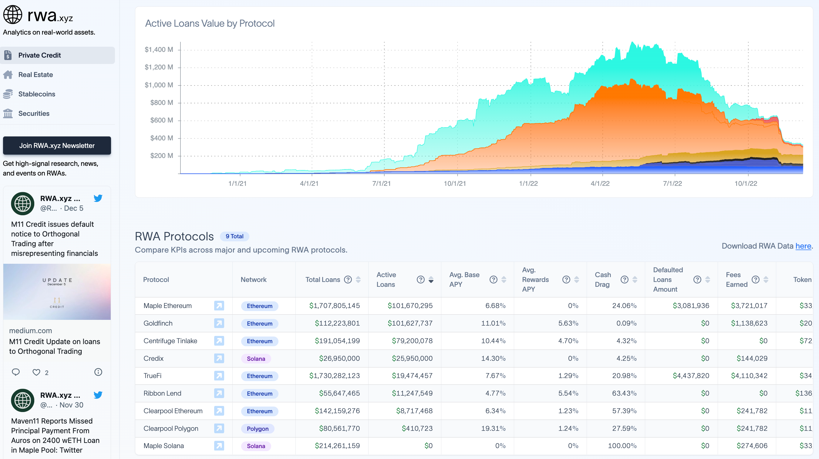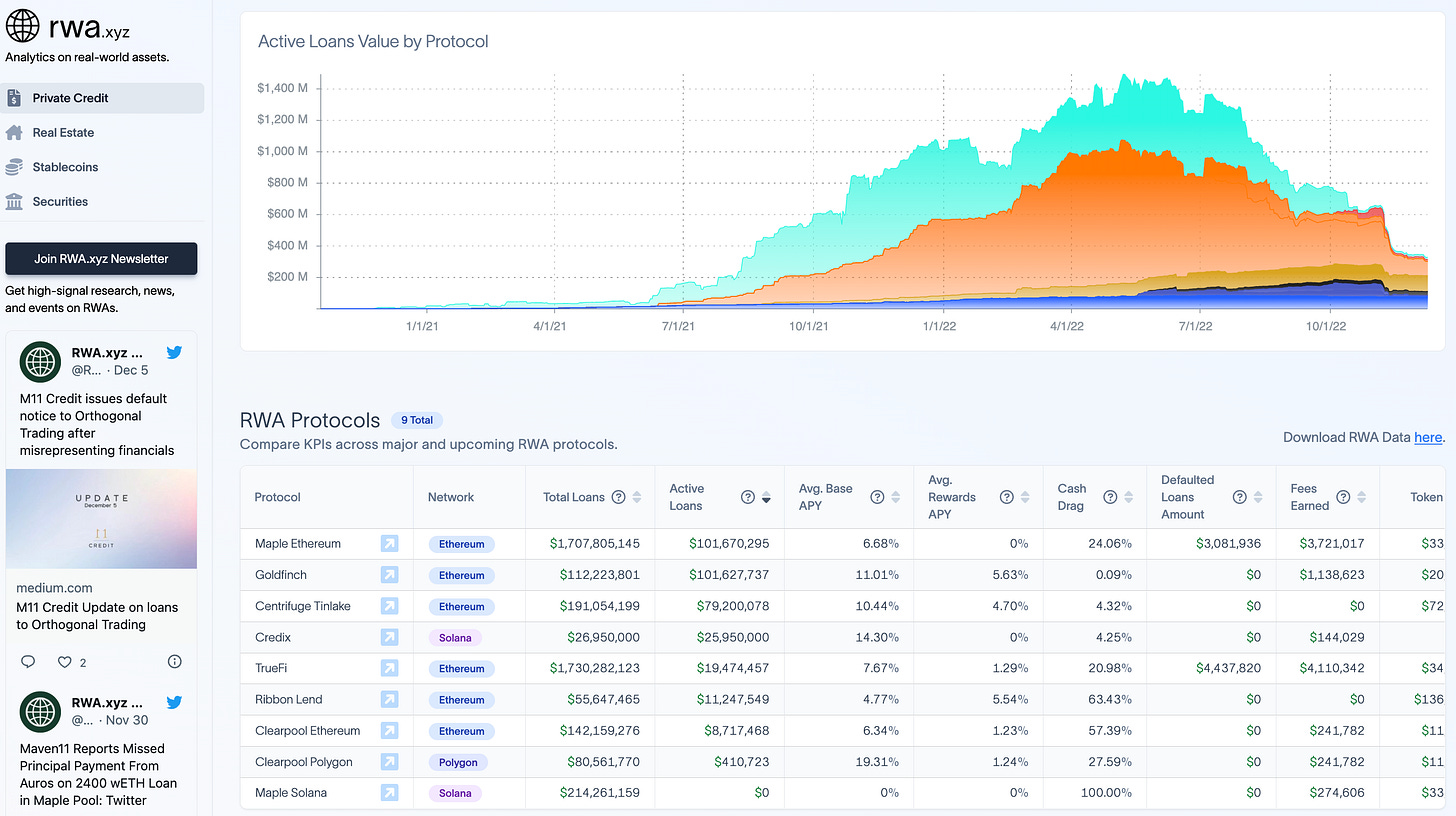RWA.xyz flashed on my radar about a month ago. On Tuesday I spoke with co-founder Adam Lawrence. They originally started the 2022 with the idea of building a Solana-based savings platform for DAOs, similar to Yearn. After several months of prototyping and customer development they concluded that the market wasnât mature enough to address, so they started looking at credit protocols like Goldfinch and Centrifuge. To quote Adam: